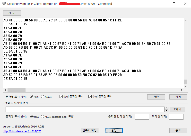 추출하는데 많이들 사용하시는 SerialPortMon에서 TCP CLIENT로 접속하면 된다.